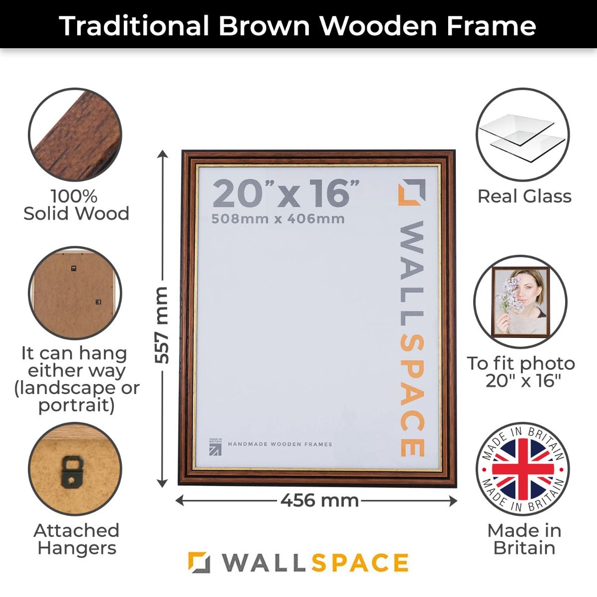 Unlike plastic or MDF photo frames, the combination of real wood and glass offers a professional finish while also being more durable, meaning our frames will last the test of time. Perspex safety glass is also available upon request (please get in touch should this be required).