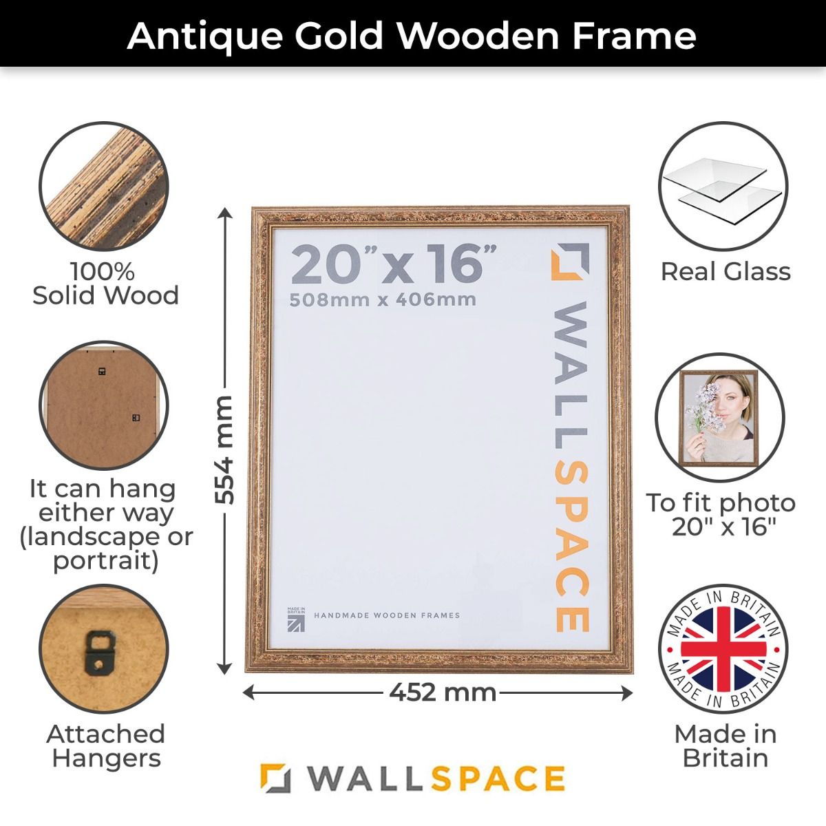 If you are looking for a 20" x 16" sized gold frame, then you can't get much better than this one. Lovingly made by ourselves this 20" x 16" elegant traditional gold picture frame will look great on any wall.